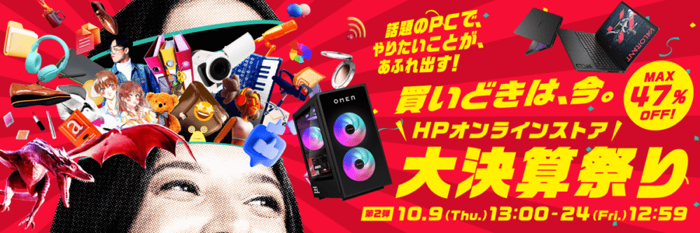 HP (OMEN) | ①週末限定セール ②アウトレットセール ③ゲーミングPC 大決算祭り | ①9/22まで ②品切れ次第 ③10/24まで | ①「最新GPU」対象 ②「旧GPU」対象 ③「最新GPU」対象 |