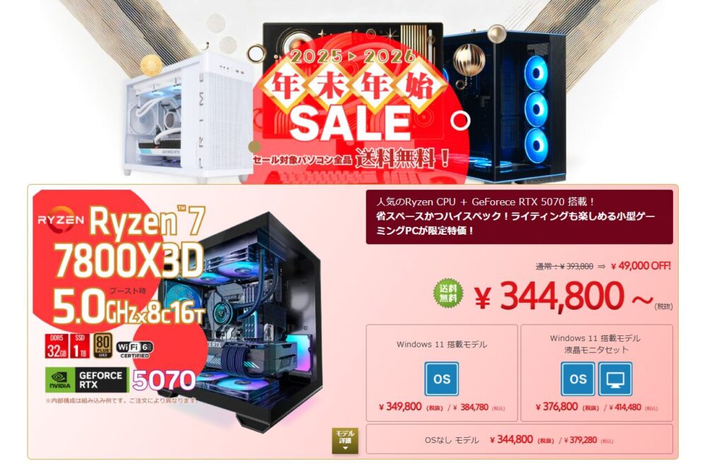 特に期間限定セールでは、ハイスペックなGPUや最新CPUを搭載したゲーミングPCが他社より安く購入できることもあり、価格重視のユーザーには見逃せないメーカーです。