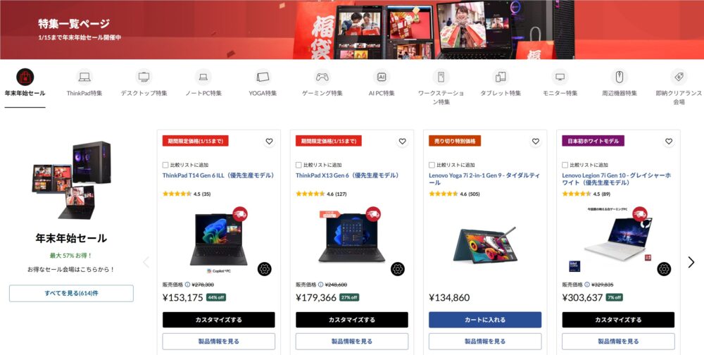 | レノボ (Legion) | ①年末年始セール | ①1/15まで |