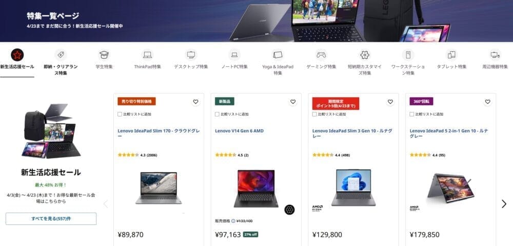 | レノボ (Legion) | ①新生活応援セール | ①4/23まで |