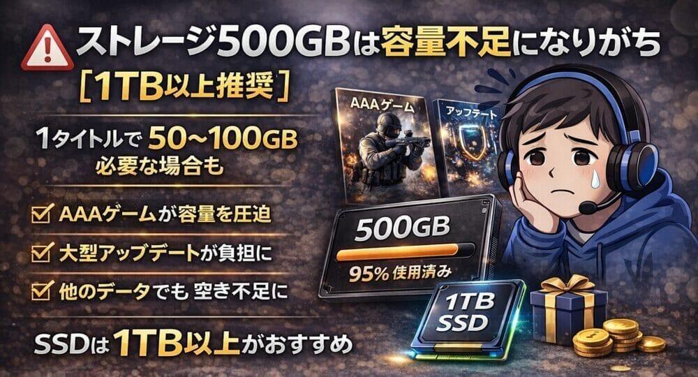 ゲーミングPCを選ぶ際、ストレージ容量500GBは一見十分に見えますが、実際には容量不足になりやすいので注意しましょう。