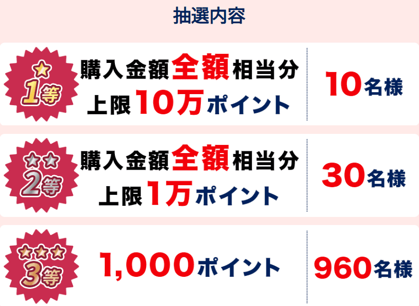 1等は購入金額の全額分(上限10万円)、2等は1万ポイント、3等は1,000ポイントが還元されるため、当選すれば実質的な負担を大きく減らせるのが魅力です。