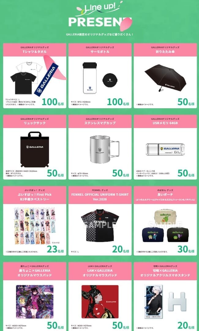 期間中に対象のGALLERIAを購入してエントリーすると、抽選でオリジナルグッズなどの特典が当たる内容になっています。