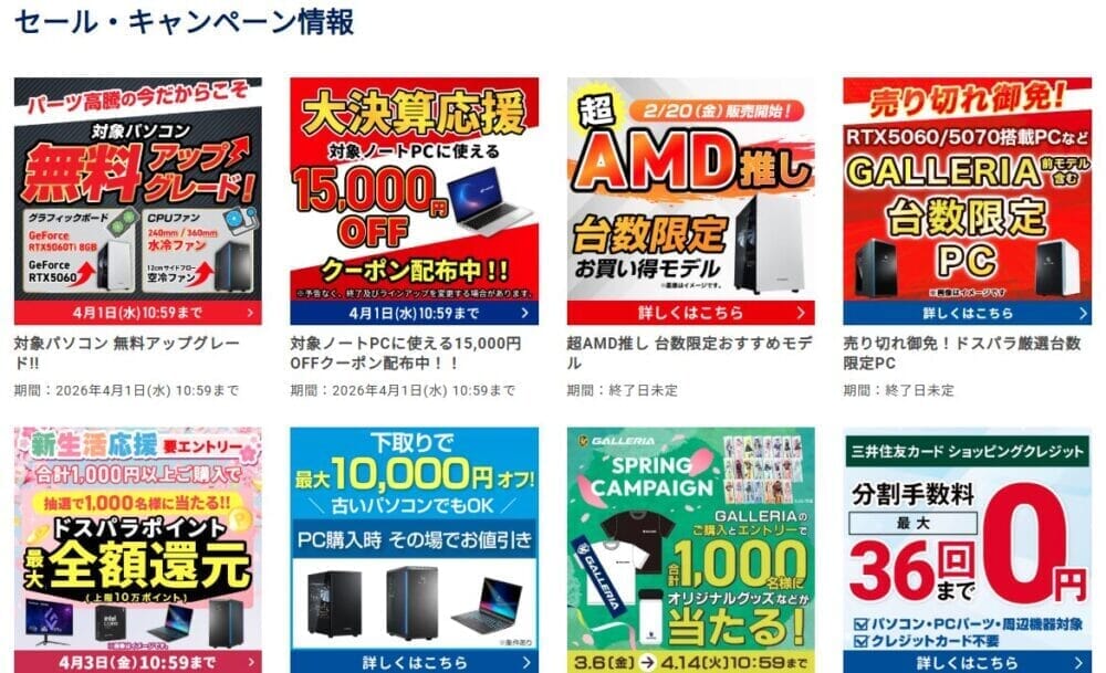 ドスパラはセールだけでなく、「ポイント還元」や「下取り」、「プレゼント」などのキャンペーンも多いため、見方が少しわかりにくいのが特徴です。