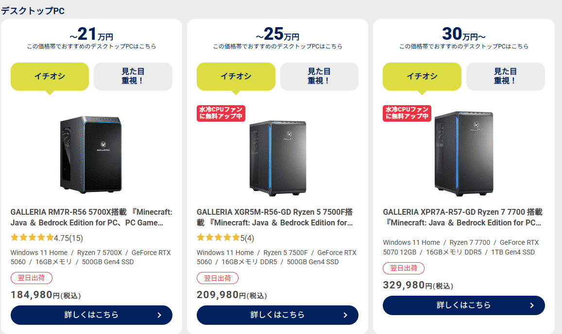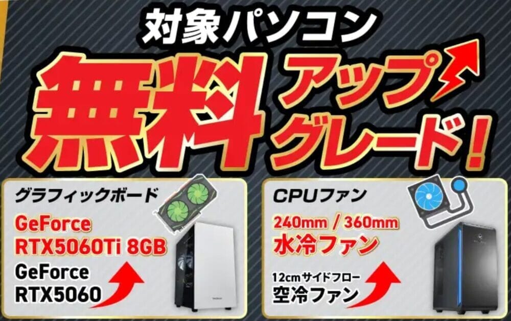 | 対象パソコン無料アップグレード | 対象PC無料アップグレード (RTX5060 → RTX5060Ti 8GB) (CPUファン 空冷 → 水冷) | 2026年4月1日まで |