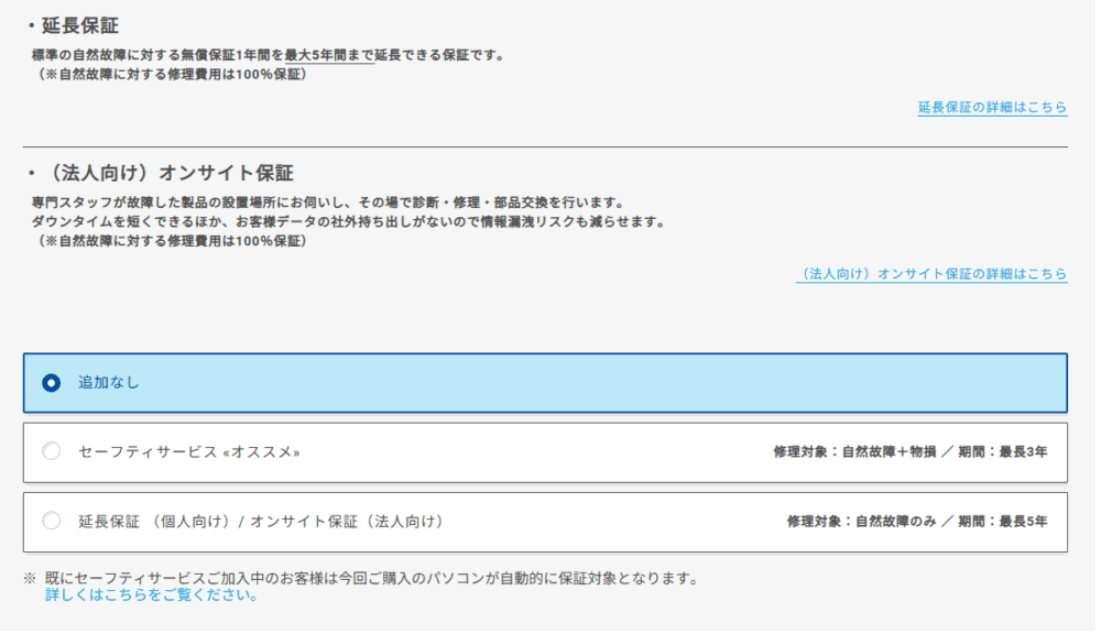 長く使う予定の方や、仕事・配信などでPCが必須の方は、延長保証を付けておくことで故障リスクへの備えになります。