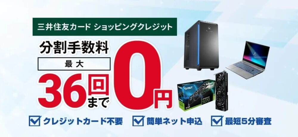 ドスパラでは、三井住友カードのショッピングクレジットを利用することで、分割払いの手数料を最大36回までドスパラ側が負担してくれます。
