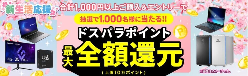| 新生活応援 | 抽選で合計1,000名様にドスパラポイント最大全額還元(上限10万ポイント) | 2026年4月3日まで |