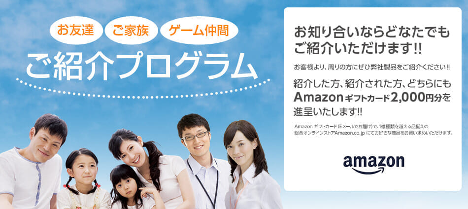過去に購入経験のある方が、パソコン購入を検討中の知人を専用フォームから紹介し、電話通販で成約すると、紹介者・紹介された方それぞれにAmazonギフトカード2,000円分を進呈されます。