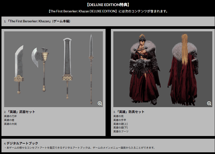 DELUXE EDITIONにはゲーム本編に加え、「英雄」武器セット・防具セット、デジタルアートブックなどの特典が含まれます。数量限定のため、なくなり次第終了となります。