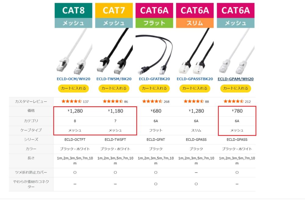 また、「CAT8」はさらに高性能ですが、家庭用・ゲーム用途では完全にオーバースペック。ケーブル自体も高価で、コスト面の負担が大きくおすすめできません。