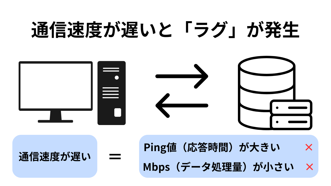 Ping値(応答速度) と Mbps(データ処理量) のどちらかが不足していると、ゲーム内で操作と動作のタイミングがズレて “ラグ” が発生します。