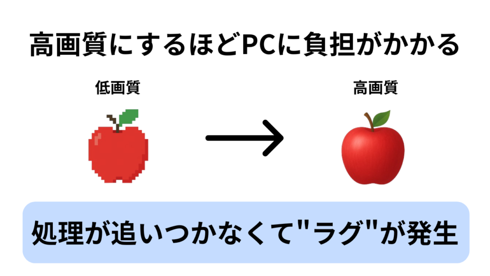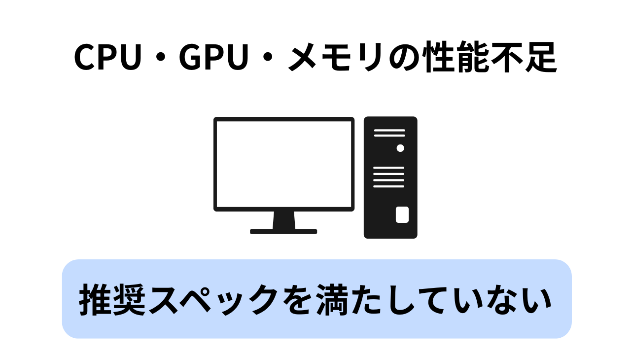 - ① PCスペック不足(CPU・GPU・メモリの性能不足)